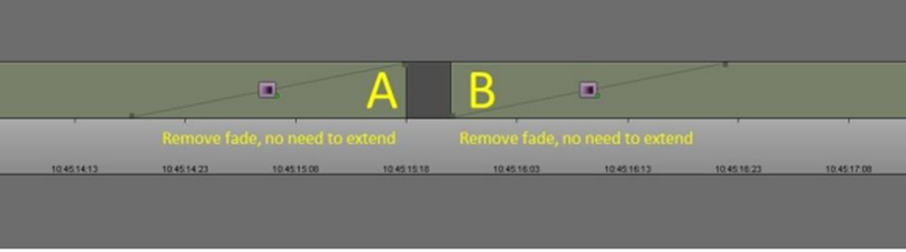 - Example 1: If the dissolve ends after the end of the clip, extend the clip to the end of the fade and remove the fade.
